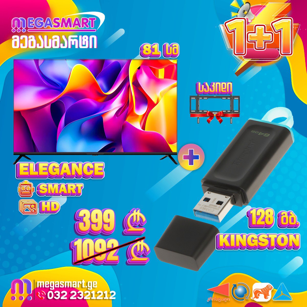 ტელევიზორი 81სმ ELEGANCE 32KV77S სმარტი 2025 ანდროიდი საჩუქრად საკიდი და მეხსიერების ბარათი Kingston DTX/128GB
