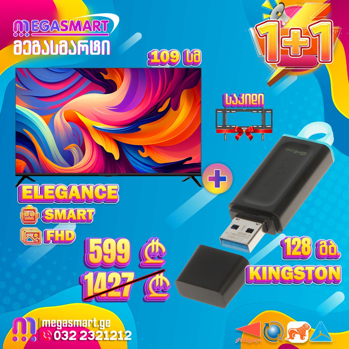 ტელევიზორი 109სმ ELEGANCE 43KV77S სმარტი ანდროიდი საჩუქრად საკიდი და მეხსიერების ბარათი Kingston DTX/128GB