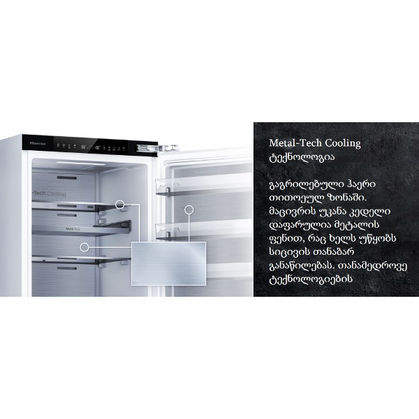 გაგრილებული ჰაერი ყველა ზონაში; მეტალის ფენა უკანა კედელზე უზრუნველყოფს ტემპერატურის თანაბარ განაწილებას.